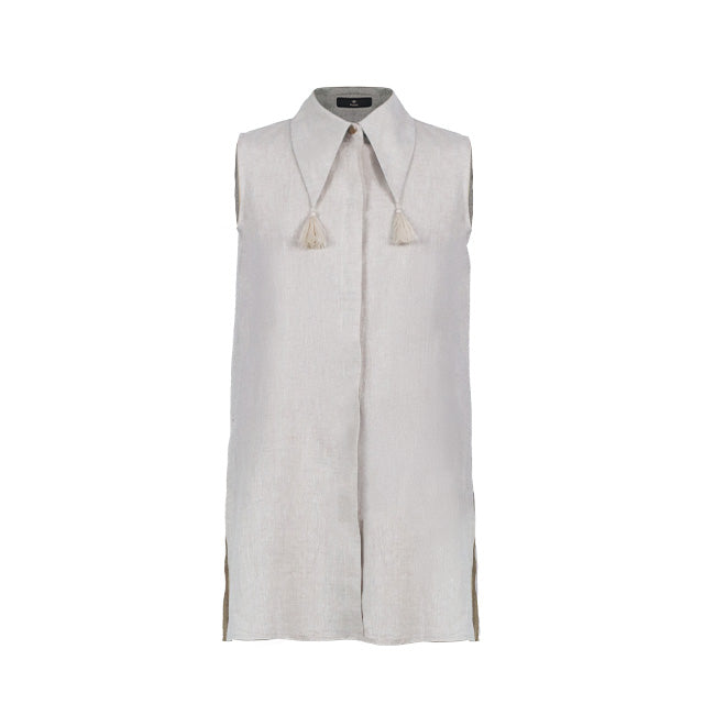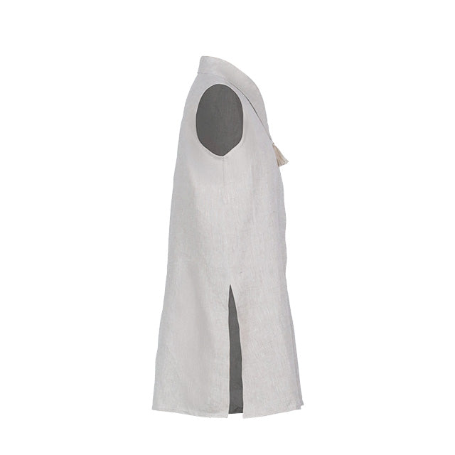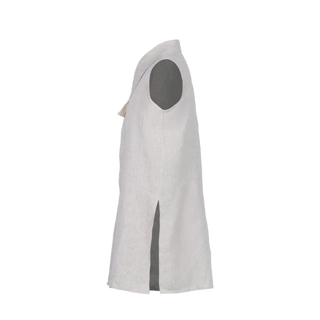 Add a pop of color to your outfit with this khaki sleeveless linen blouse featuring a stylish tassel-trimmed collar. Simple yet refined, the decorative tassels give a subtle boho-chic twist to a classic design. Made from 100% linen, this top is breathable and lightweight—perfect for both busy workdays and relaxed weekends.